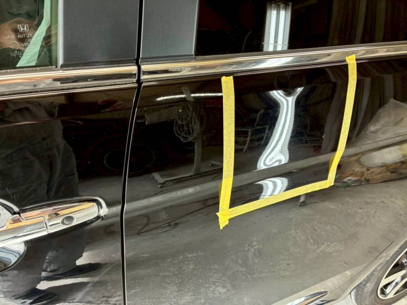 今回はホンダ N-ONEの左リアドアへこみ修理をご紹介します。駐車中にポールに接触してしまい、ドア中央部に目立つへこみができてしまったとのことでご来店いただきました。