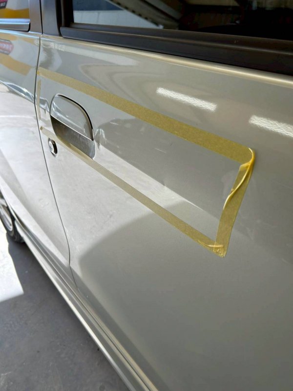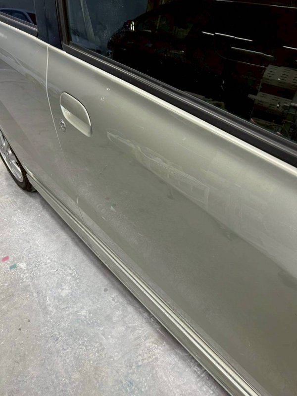 修理では、まずドアの形を元のラインに合わせて丁寧に鈑金し、その後パテで微調整して平滑に仕上げます。塗装では現在の車体色に合わせて周囲の色を見ながら調色し、違和感が出ないように境目を丁寧にぼかして仕上げました。新車時のレシピではなく“今の色”に合わせるのがポイントです。