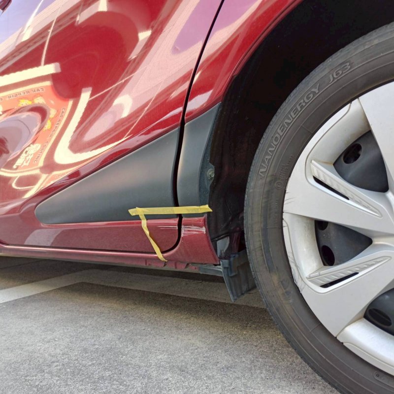 今回はトヨタ・シエンタの左リアドアすりキズと左リアフェンダーのへこみ修理をご紹介します。駐車時の自損による損傷で、ドア下部には擦りキズ、フェンダー部分には小さなへこみが確認されました。
