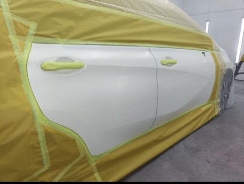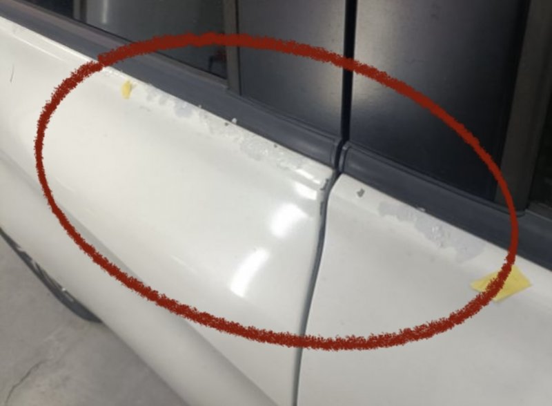 右側のドア2枚にわたるキズを丁寧に修復。ホワイトのボディは色の差が出やすいですが、プロの調色技術により、修理箇所がわからないほど美しく馴染ませました。