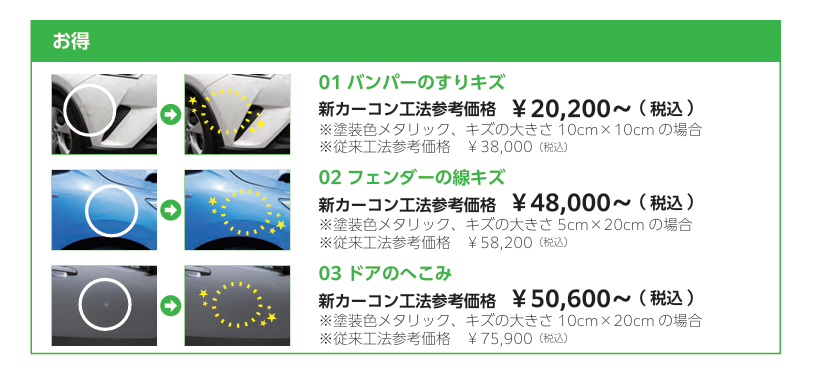 カーコンビニ倶楽部は独自の新工法により、ムダを省いた低価格を実現。また、カーコンはどんな車の色も分析して作ることができ、色味、仕上がりもキレイです。お客様のご予算にあわせてリーズナブルな修理が可能です。もちろん、小さなキズだけでなく大きな損傷(事故など)まで対応いたします。【全メーカー対応】